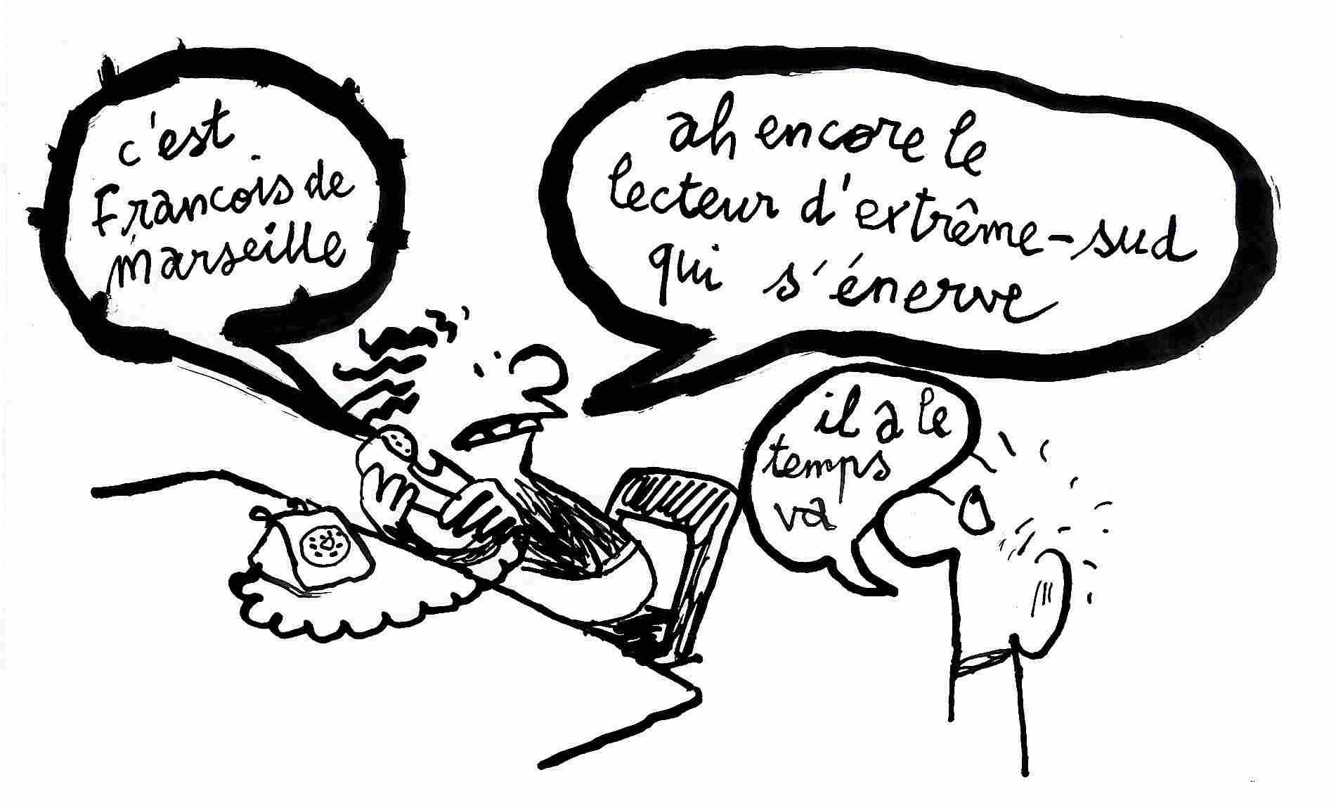 « Allô, ouais c’est François de Marseille… Alors vraiment c’est super ce que vous faites, mais vraiment il y a quelque chose qui m’énerve, mais m’énerve. Extrême droite, il n’y a pas de tiret, et dans le dernier numéro plusieurs fois vous en mettez un et c’est pas la première fois que je le remarque, et ça m’agace… Extrême droite, c’est sans tiret ! »