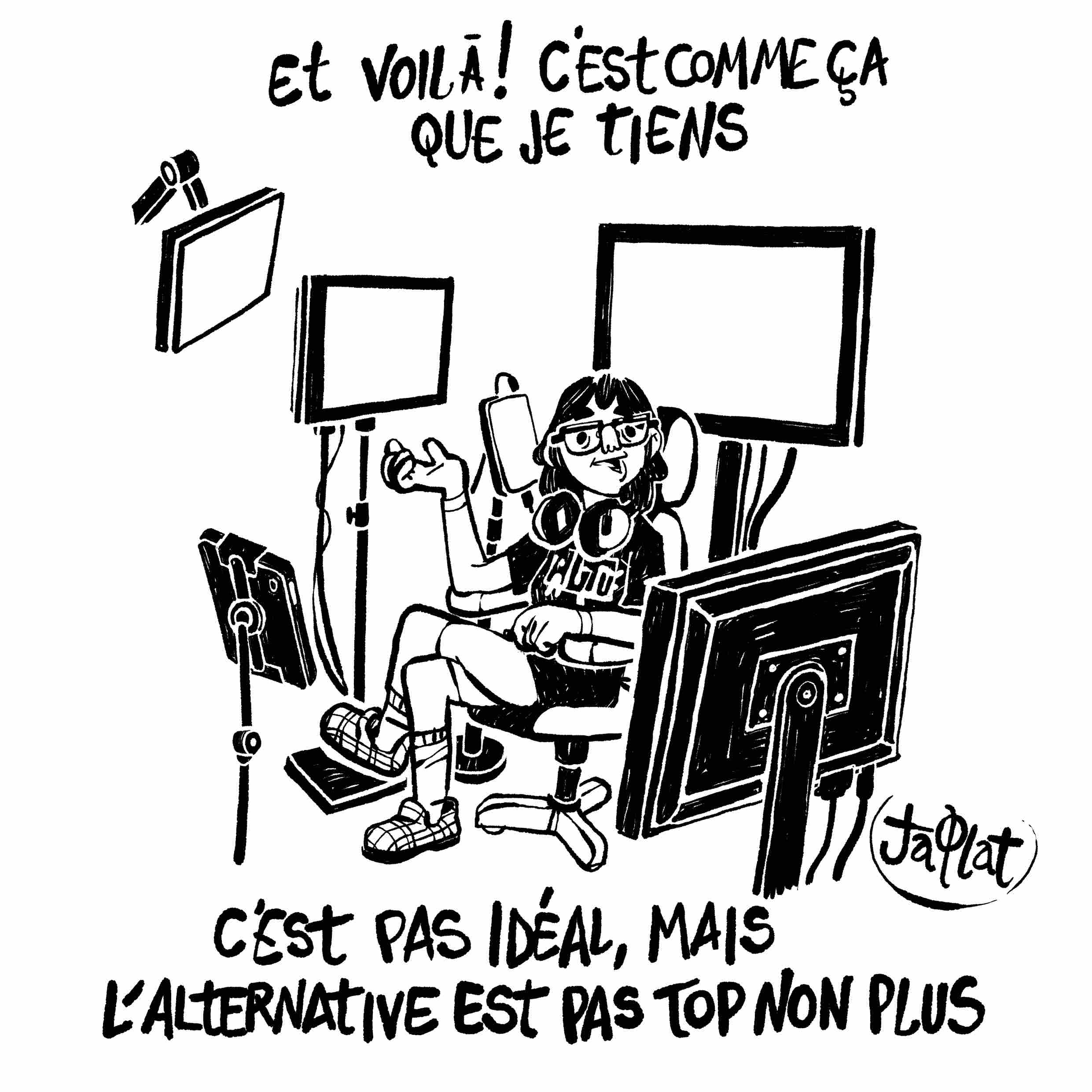 Pour moi qui viens parler de lutte contre le numérique, l’entrée dans la pièce en question est un choc : trois écrans plats, deux tours avec en façade des anneaux de lumière, des pavés numériques à LED dont je ne comprends même pas l’usage… L’antre de deux gamers, Caroline et son copain. À ce moment de l’histoire, je projette beaucoup. J’ai l’image de la gamine paumée, incohérente, happée par la mégamachine, l’interview ne donnera rien, j’aurais pas dû venir, il est déjà 14h30 on n’a même pas commencé… Elle lance un logiciel d’enregistrement et de streaming, en évitant de cliquer sur « stream » pour que ses followers n’entendent pas notre conversation en live – « J’suis une grande fan de figurines fantastiques on me fait des donations en ligne pour ça sur Twitch, ma mère n’est pas très contente mais moi je gagne un peu d’argent comme ça. » Toujours sans transition ça commence : « Merci d’être venu pour l’interview, que pensez-vous de la stratégie RSE [Responsabilité sociétale des entreprises] de Soitec ? » Euh…